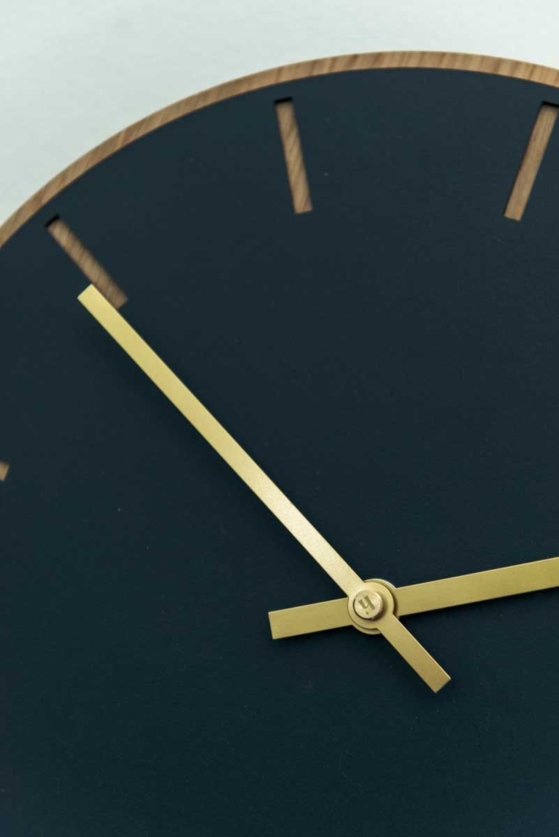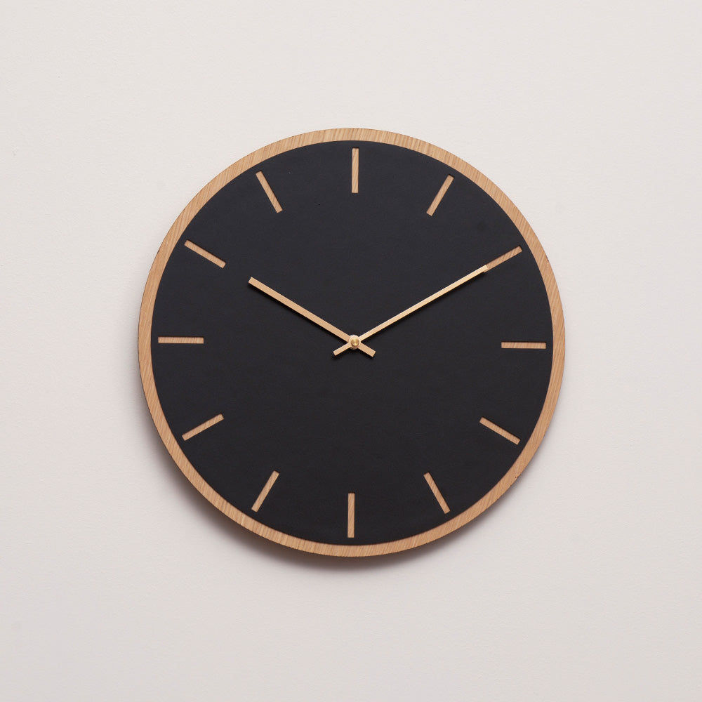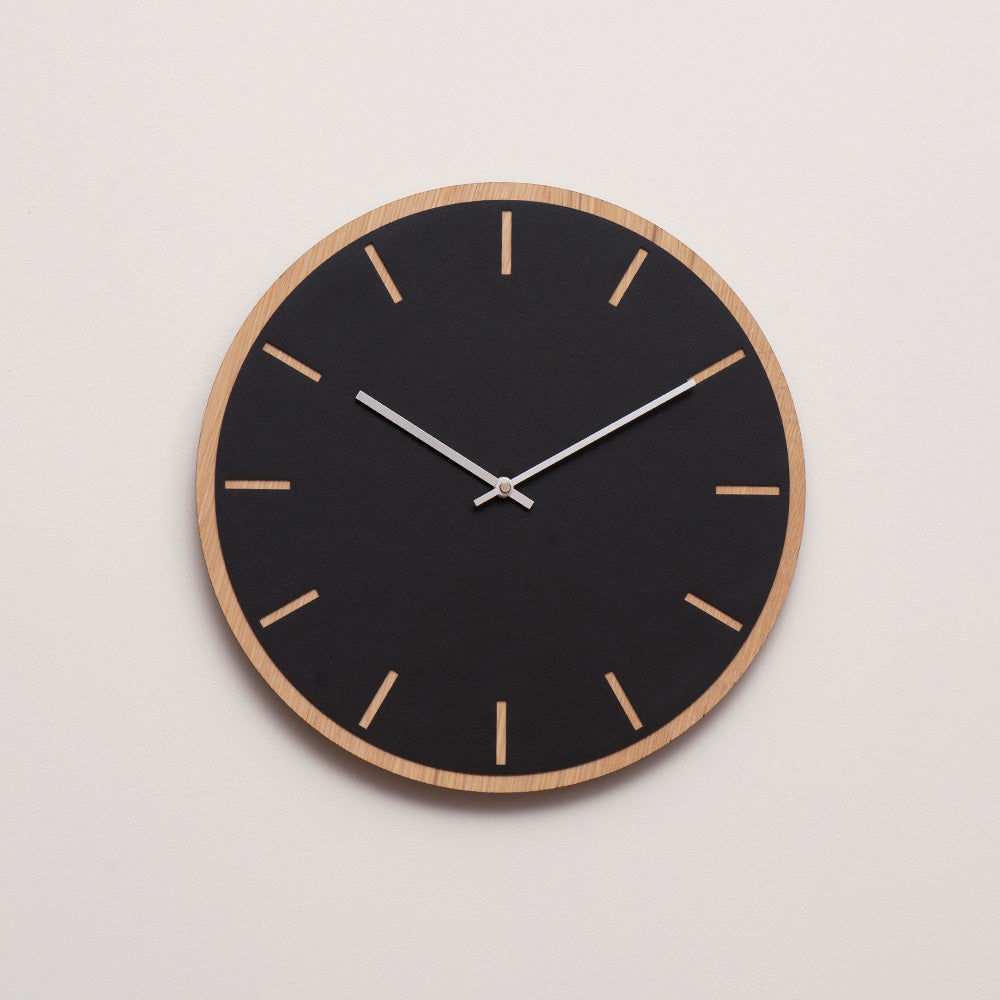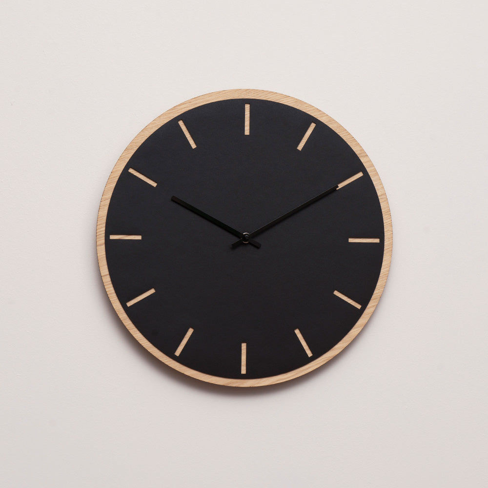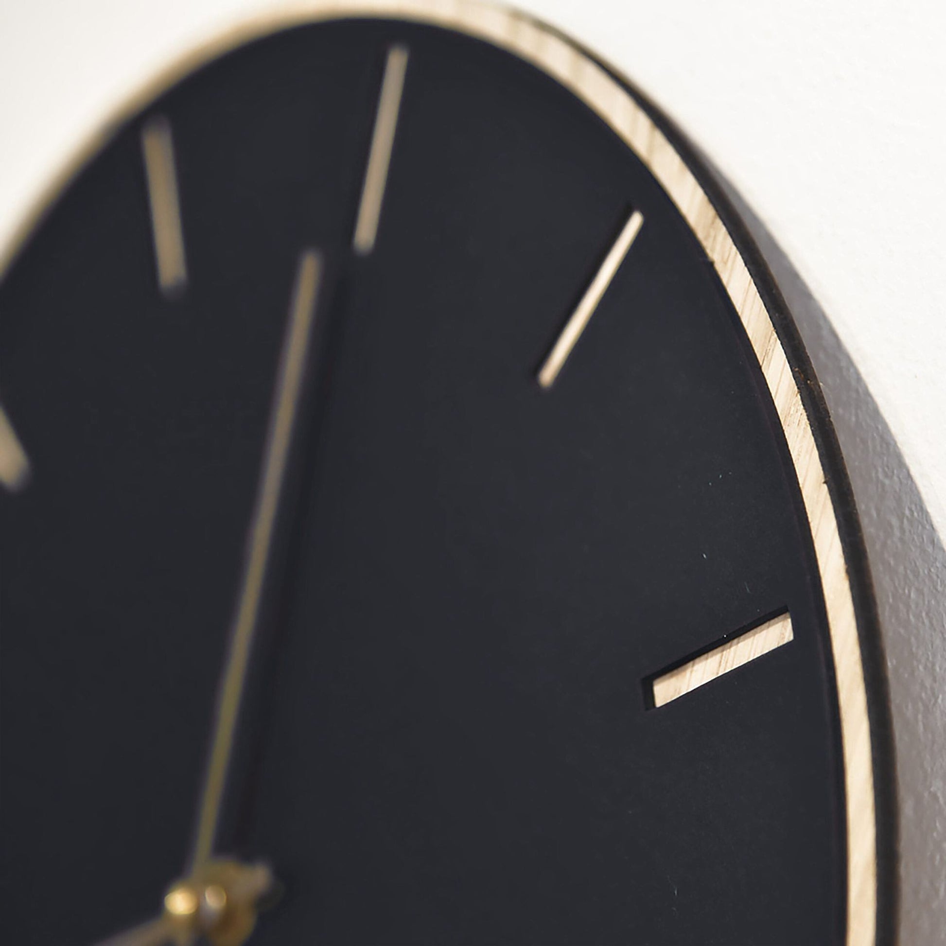 Une horloge murale simple et minimaliste aux couleurs monochromes. Le placage en chêne très clair contraste avec le linoléum noir, dont les index des heures sculptés ressortent encore davantage. Le cadran rond noir classique lui confère une allure exclusive et peut être associé à des aiguilles dorées ou cuivrées pour une ambiance chaleureuse, ou encore à des aiguilles noires ou argentées pour un effet ton sur ton.