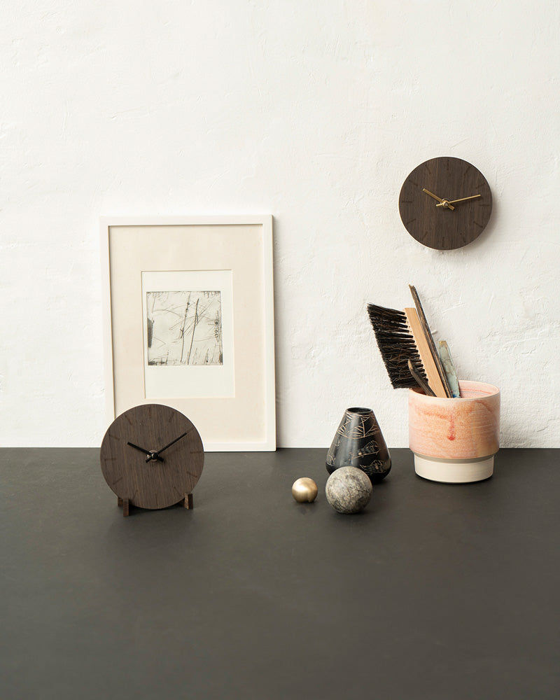 Une petite horloge élégante, à poser ou à accrocher au mur, qui trouvera parfaitement sa place sur une étagère, une table de chevet ou une étagère de cuisine. Son format compact lui permet de s'intégrer dans presque tous les intérieurs. Le cadran est sculpté dans du chêne foncé, et chaque horloge est unique, les veines du bois variant d'une pièce à l'autre. Elle est fournie avec un support pratique, réalisé dans le même bois, et vous pouvez choisir le type d'aiguilles que vous souhaitez, en fonction de leur position par rapport au cadran.