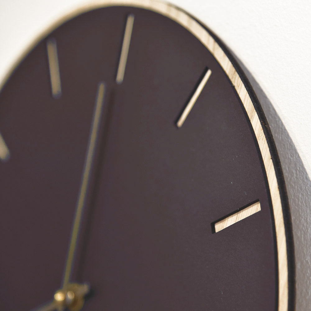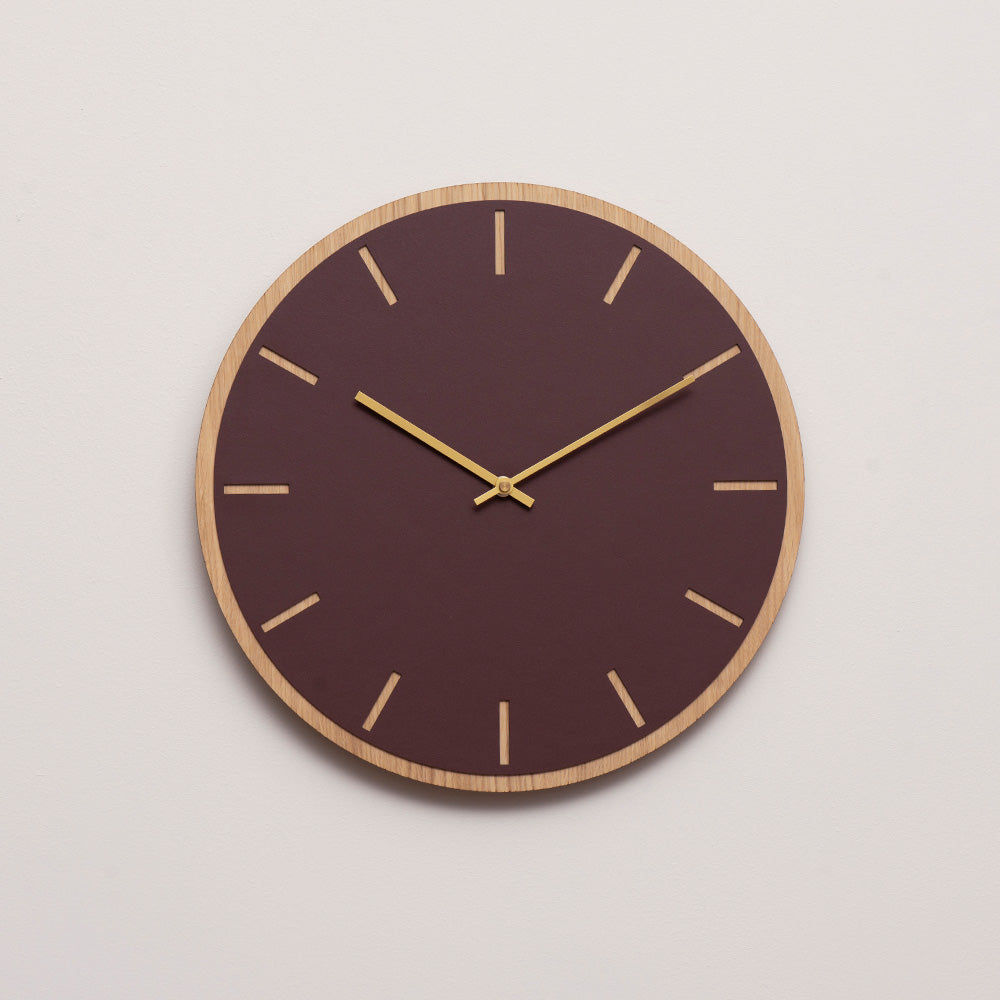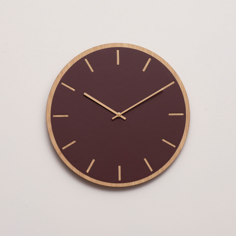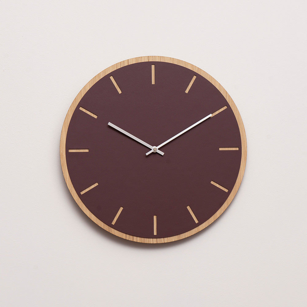 Une horloge murale minimaliste et épurée. Son cadran rond en placage de chêne clair, recouvert d'un linoléum rouge bordeaux chaleureux, met parfaitement en valeur les index des heures. Le contraste entre le bois et le linoléum confère à l'horloge beaucoup de caractère. Choisissez parmi des aiguilles argentées, dorées, noires ou cuivrées, selon vos préférences.