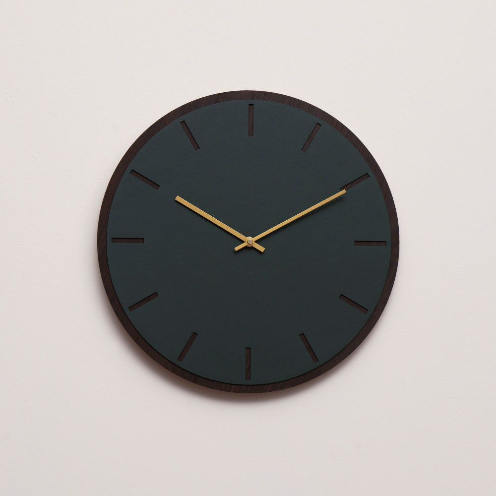 Un socle en placage de chêne foncé et un cadran en linoléum vert foncé orné d'index gravés soulignent le style sobre de cette horloge murale. Son allure minimaliste s'intègre parfaitement à tout intérieur moderne. Choisissez les aiguilles que vous souhaitez ajouter, selon l'effet désiré sur le cadran.