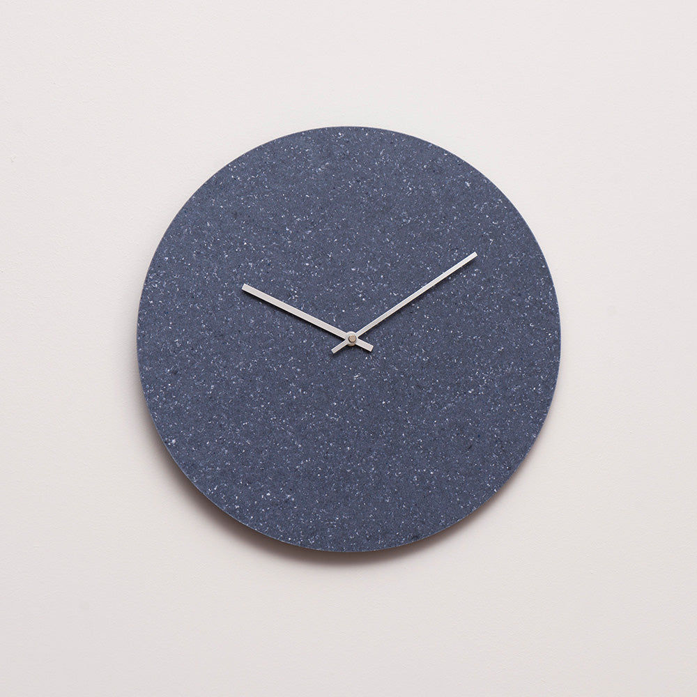 Cette horloge murale ronde et bleue est fabriquée à partir d'un noyau composé de fournitures hospitalières recyclées et d'une couche extérieure provenant des chutes de la production de tissus d'ameublement de Kvadrat. Son design minimaliste et épuré s'intègre parfaitement dans la plupart des intérieurs modernes et convient aux propriétaires soucieux de l'environnement. Sa douce couleur bleue apporte une touche de gaieté à la maison.